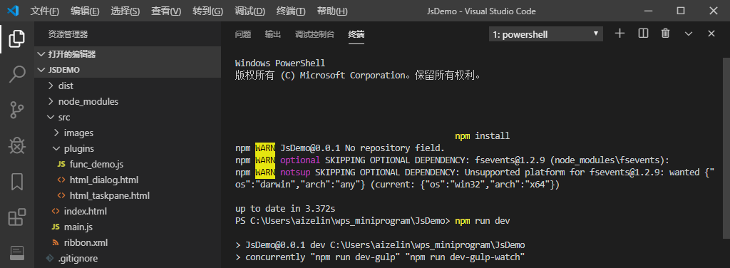 运行插件。打开 Visual Studio Code 终端,执行 npm install 安装前端开发所需插件; 执行npm run dev后自动启动了 WPS 程序。