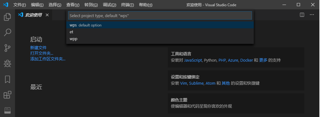 使用代码自动补全,打开 Visual Studio Code 命令面板,执行 get WPS types