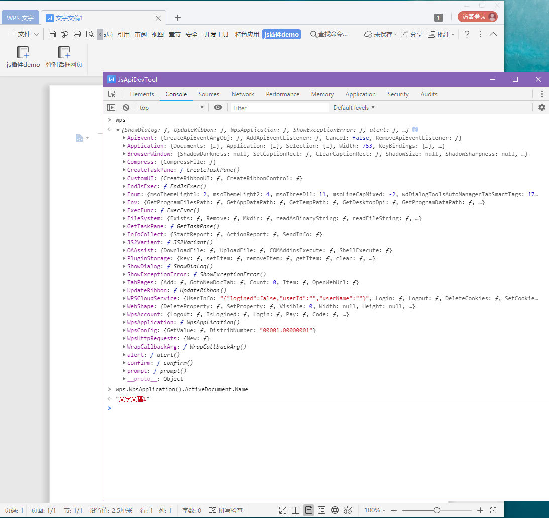 WPS 加载项调试是对其中的一个网页单独进行的调试。调试时会弹出一个独立调试器对话框,除此之外和网页调试基本一致。 可以在调试器的 Console 中直接查看任意的 API 属性和调用 API 方法。调试自动生成的index.html网页,使用快捷键 ALT + F12。 注意调试过程中需要先关闭alert或其它同步弹框,才能继续向下调试。