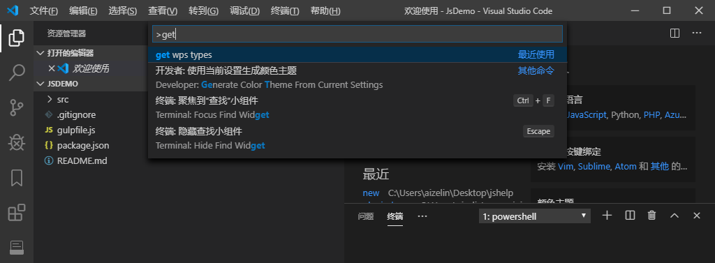 使用代码自动补全,打开 Visual Studio Code 命令面板,执行 get WPS types