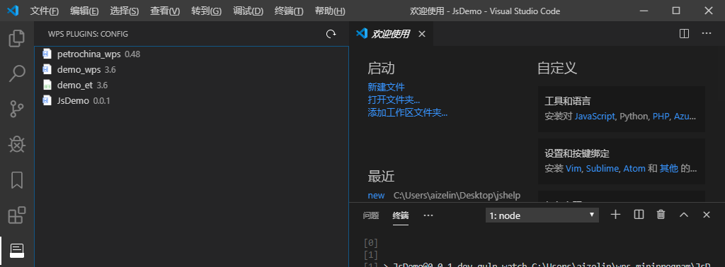 运行插件。打开 Visual Studio Code 终端,执行 npm install 安装前端开发所需插件; 执行npm run dev后自动启动了 WPS 程序。
